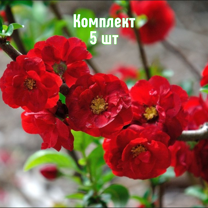 Саженцы айвы японской «Crimson and Gold» — набор 5 шт. Отличный выбор для декоративного и плодового уголка сада: компактный куст 1–1,2 м, медленный рост, прочные оливково‑зеленые побеги с колючками, глянцевые овально‑яйцевидные листья и эффектное весеннее цветение алыми цветками. После цветения формируются небольшие съедобные желтые плоды.