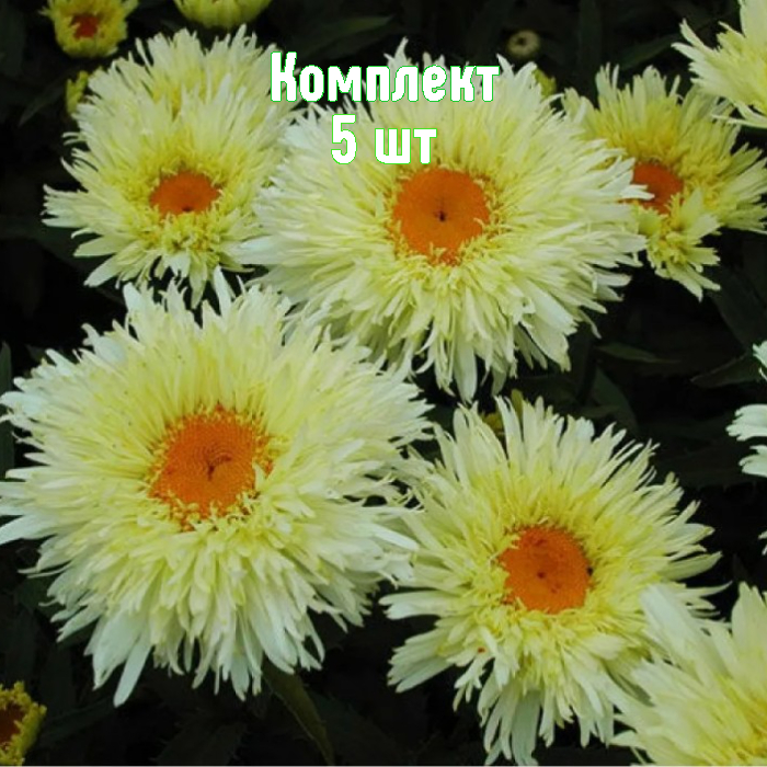 Саженцы нивяника Голдрауш — комплект из 5 растений, идеально подходящих для создания ярких многолетних посадок. Крупные махровые соцветия диаметром около 10 см: узкие бело-кремовые лепестки с изящной бахромой и лимонно-жёлтым центром. Цветение продолжительное — с конца июня до августа. Кусты высотой 60–70 см, ширина 40–50 см, прямые крепкие стебли и глянцевые рассечённые листья.