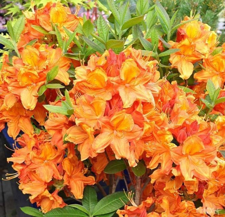 Саженец рододендрона Glowing Embers — листопадный гибрид Knap Hill Hybrid с компактной полушаровидной кроной до 1,2 м в высоту и около 1 м в ширину. Побеги прямостоячие, прирост 8–12 см в год. Листья мягкие, заострённые (примерно 10×4–5 см): летом ярко‑зелёные, осенью переходят в жёлтые, оранжевые и красные тона. В мае — шаровидные соцветия по 8–10 ярко‑оранжевых воронковидных цветов (~6 см), ароматные, цветение 2–3 недели.